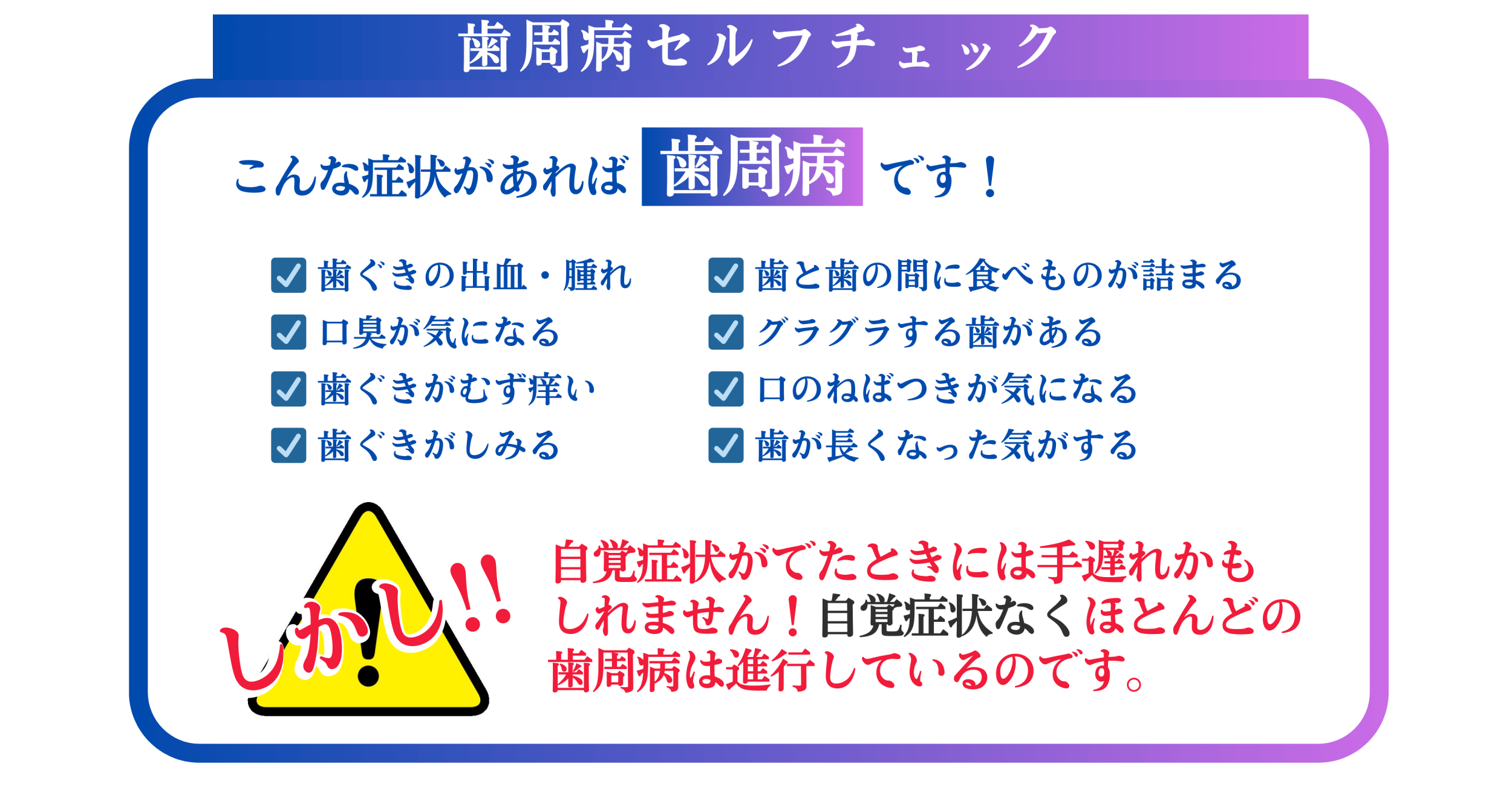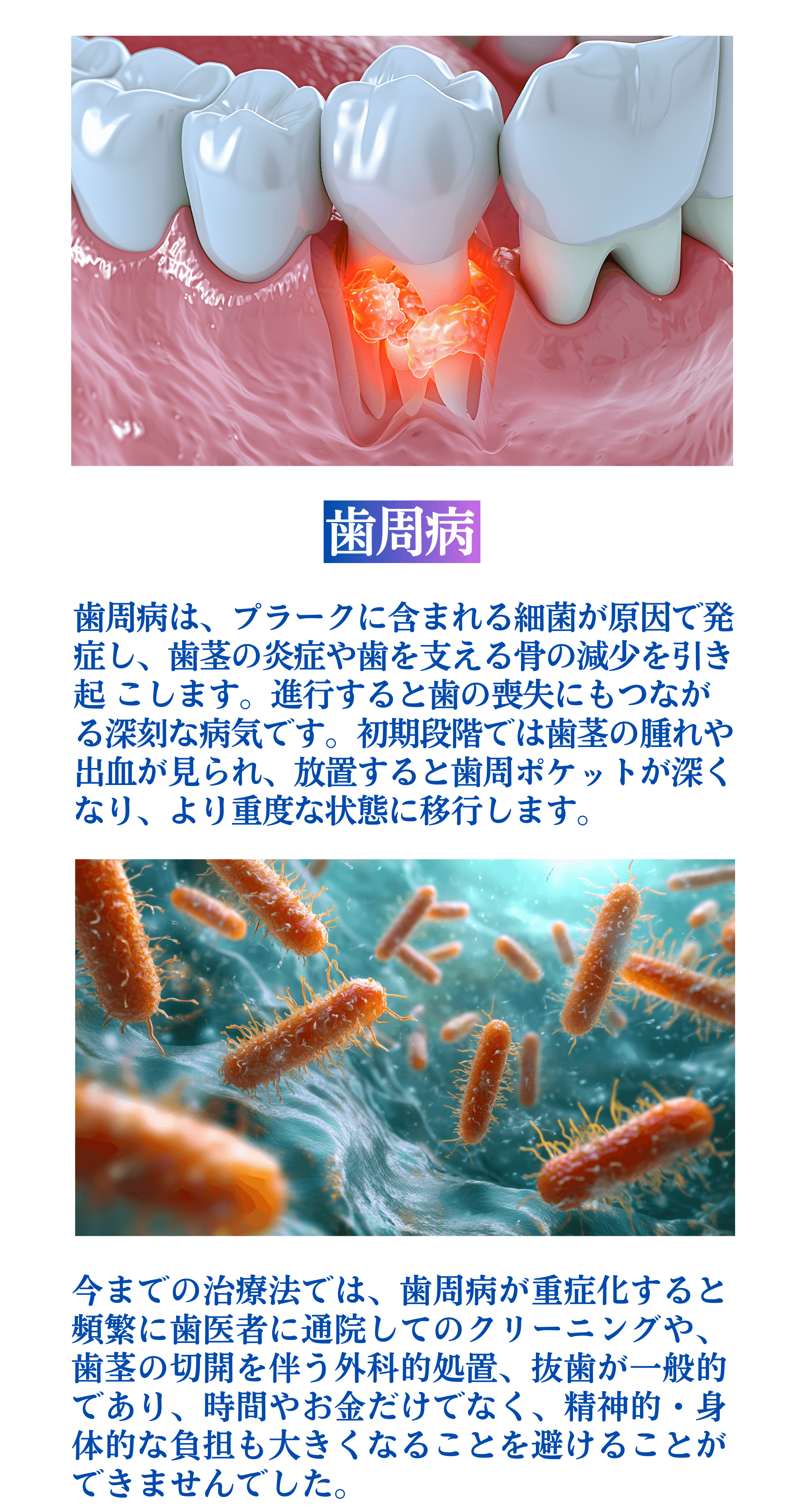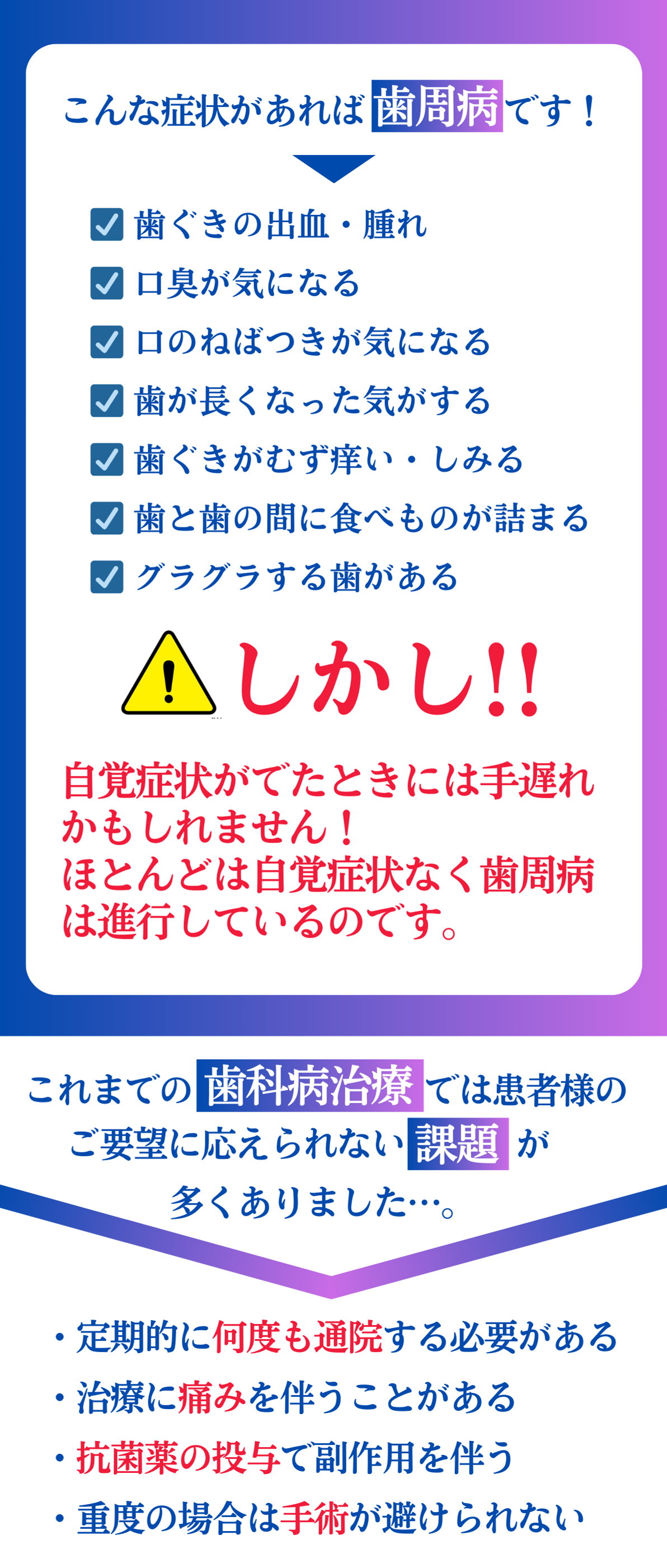 軽度から重度の歯周病患者まで幅広く適応可能です。特に外科手術を避けたい方に最適です。 歯周病がひどくなくても歯周病予防のメンテナンスとして受けていただいても結構です。