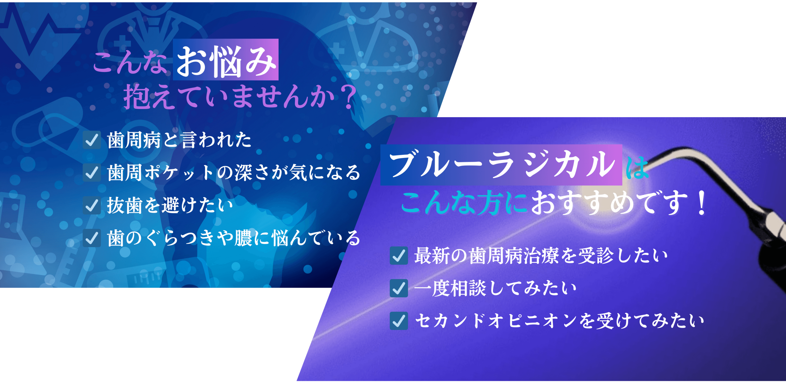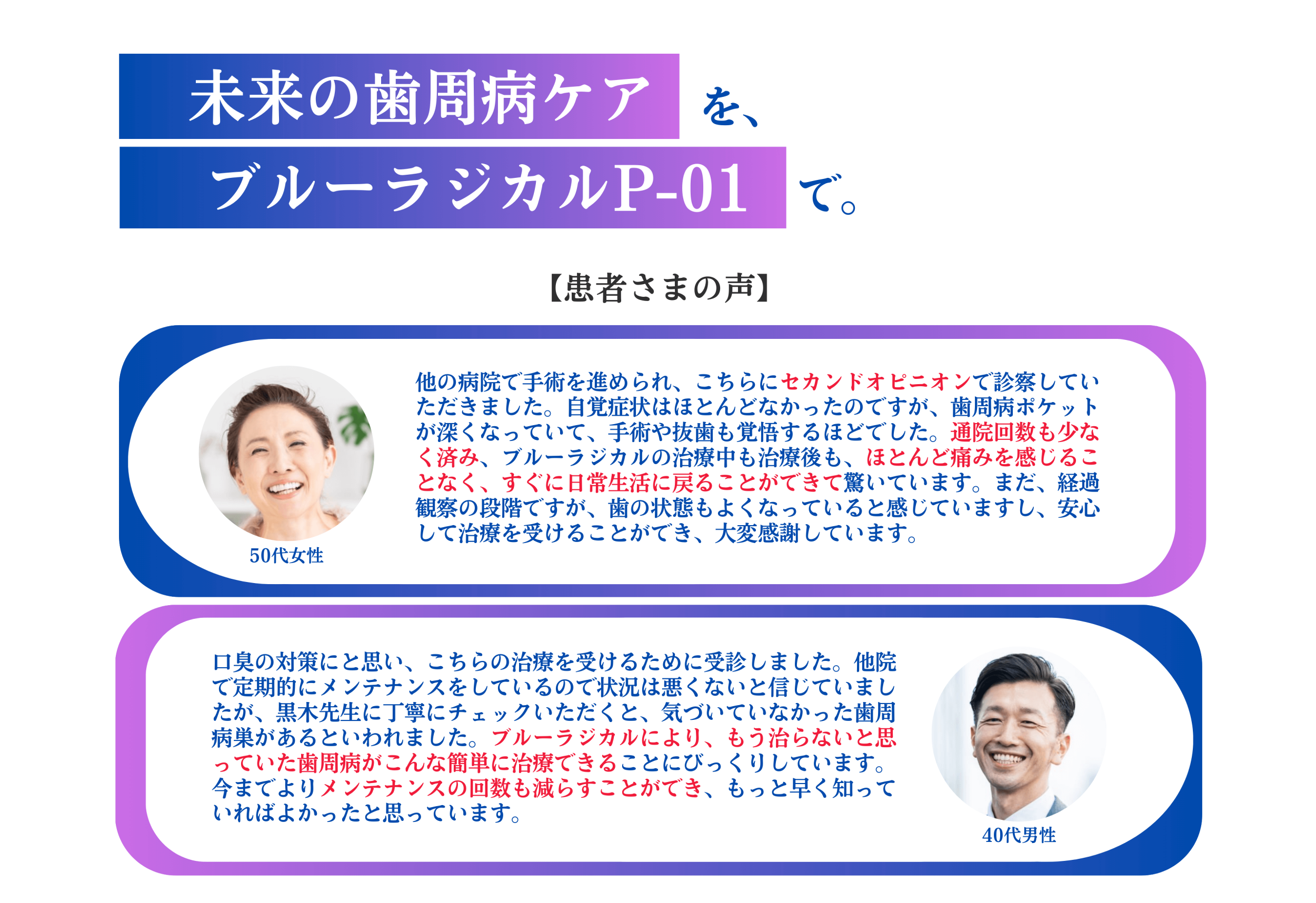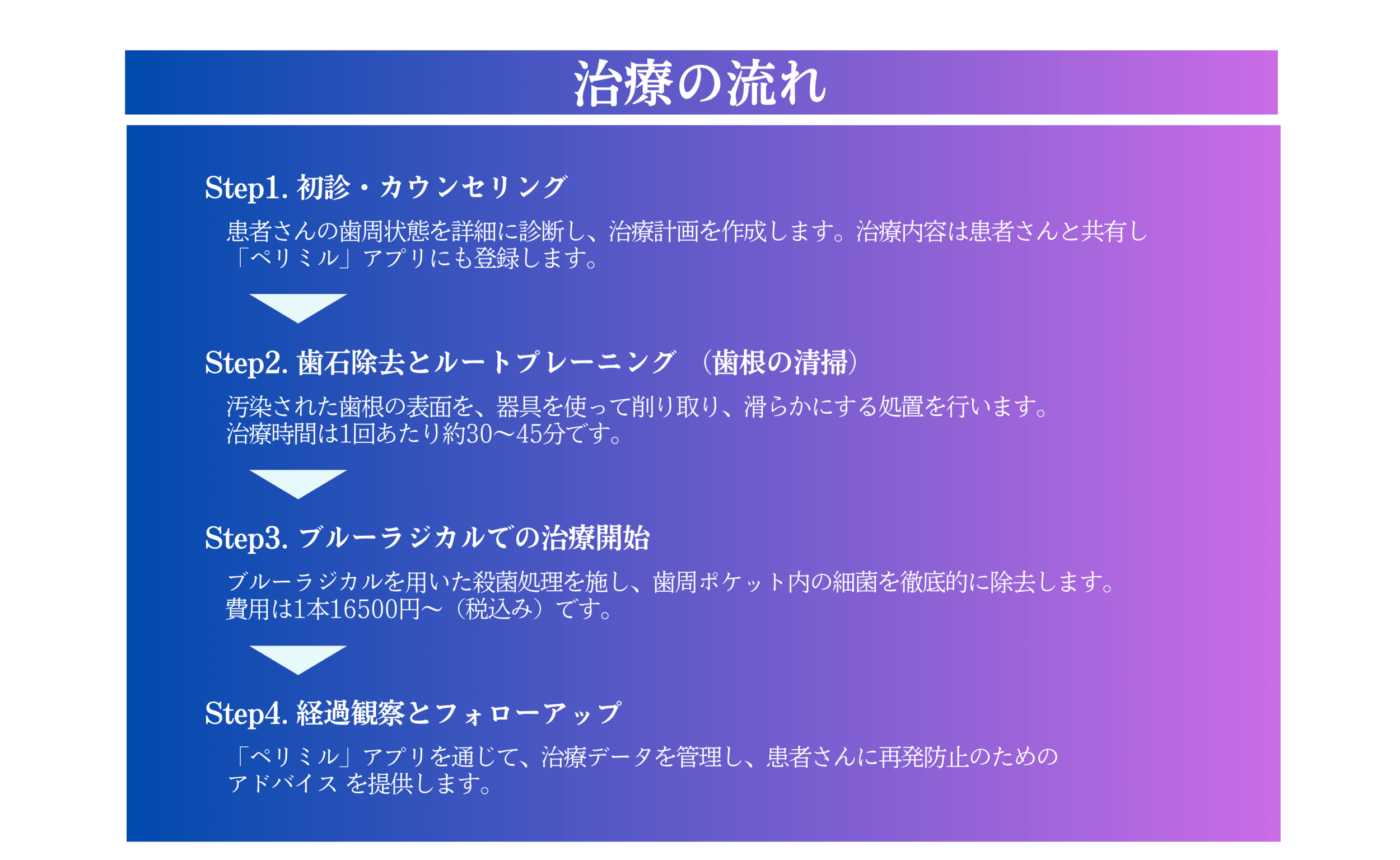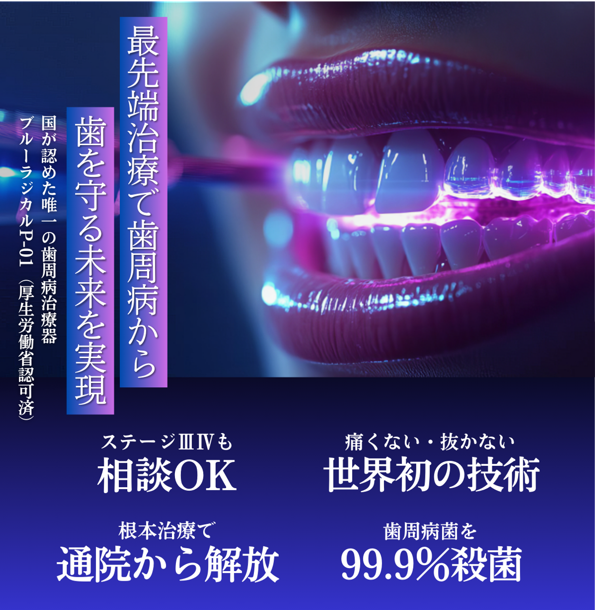 ・ブルーラジカル治療が効果を発揮しない場合は、複数回のブルーラジカル治療、歯周外科治療、抜歯などの処置を検討することがあります。