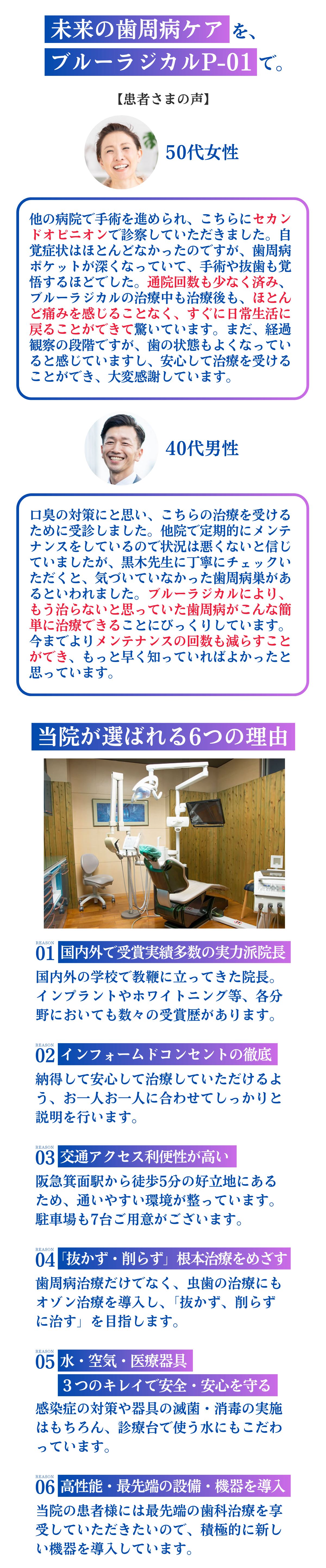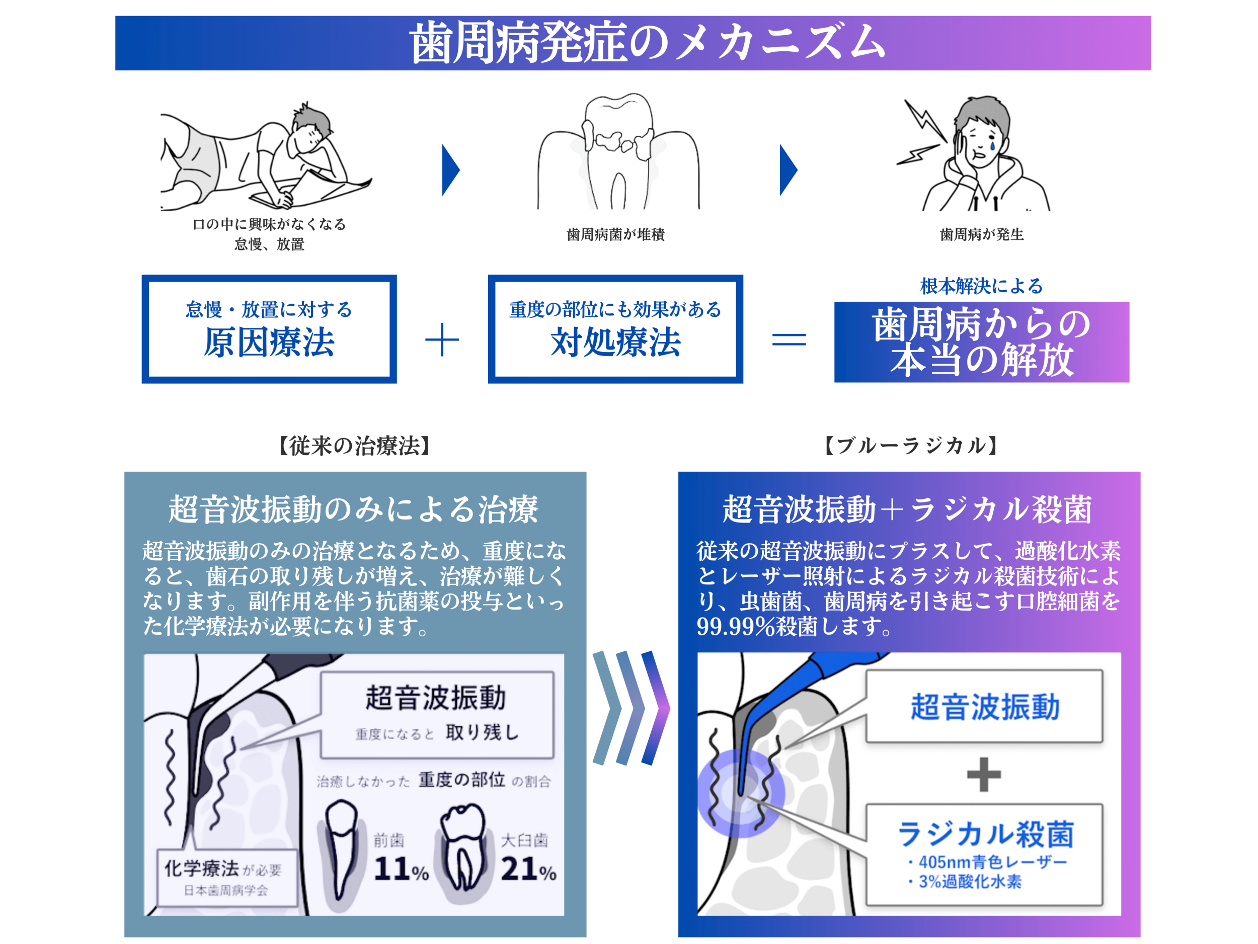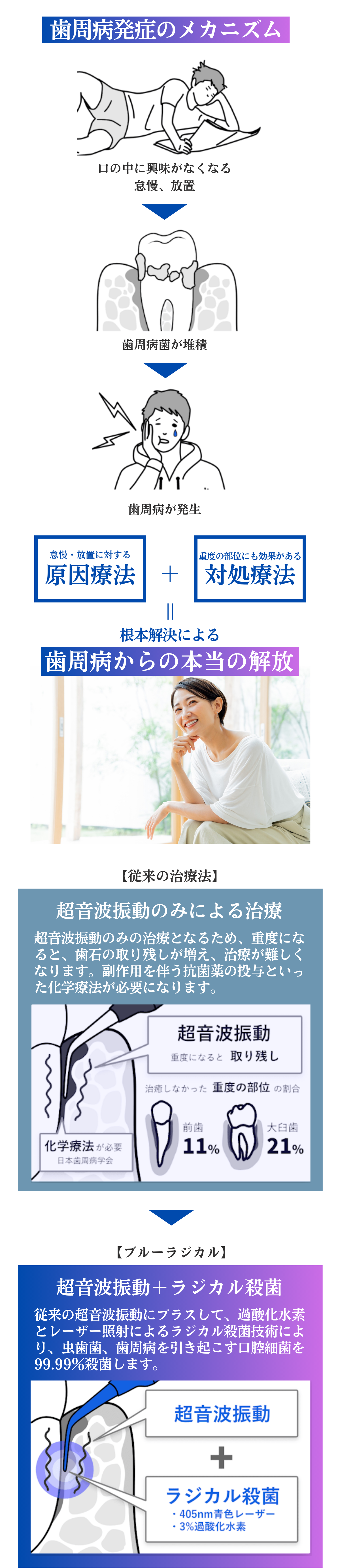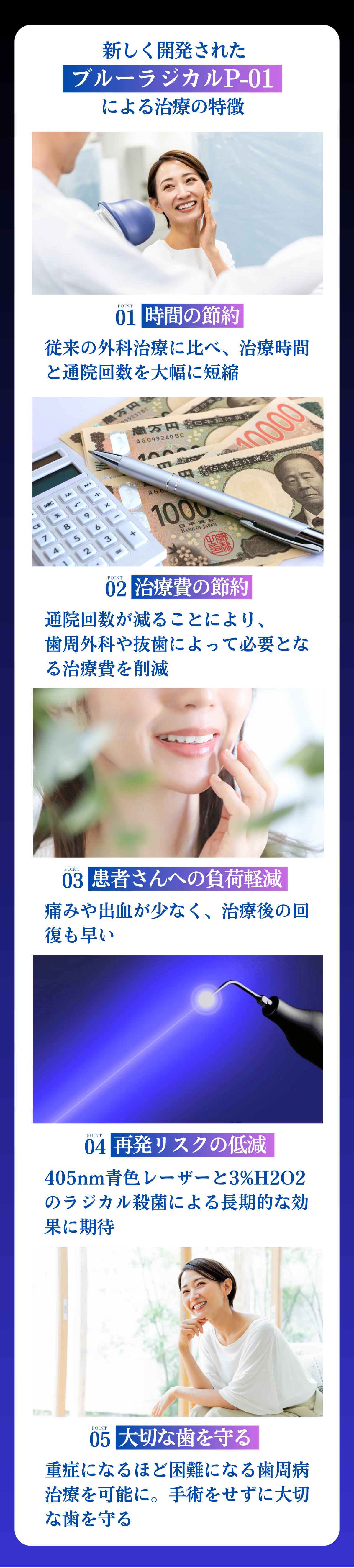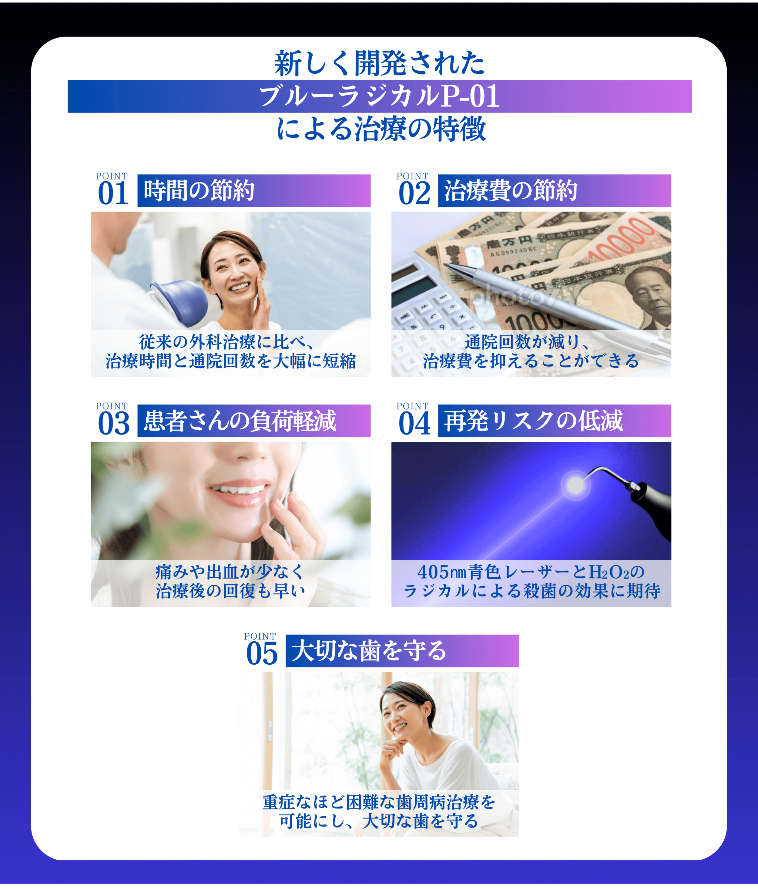 ・ブルーラジカル治療が効果を発揮しない場合は、複数回のブルーラジカル治療、歯周外科治療、抜歯などの処置を検討することがあります。