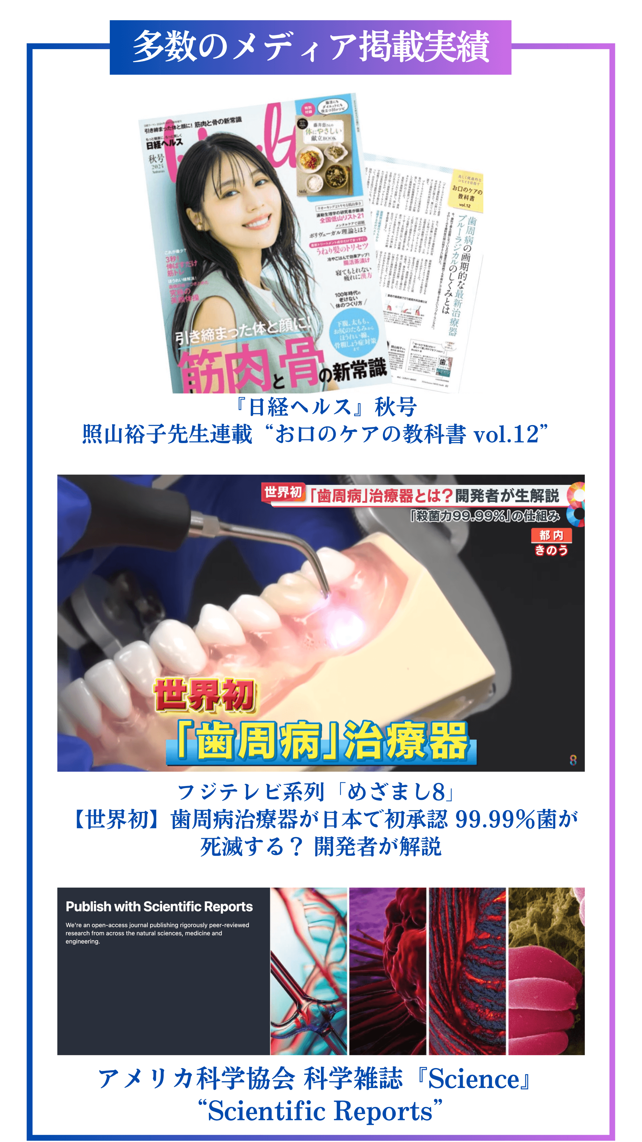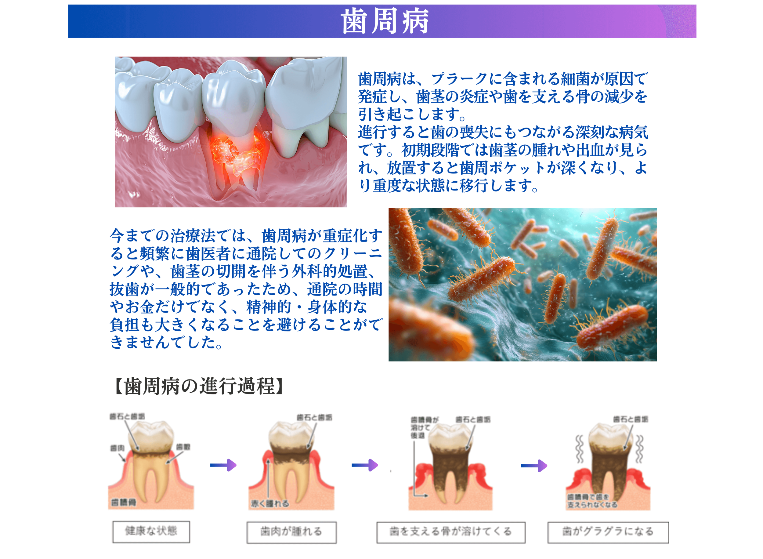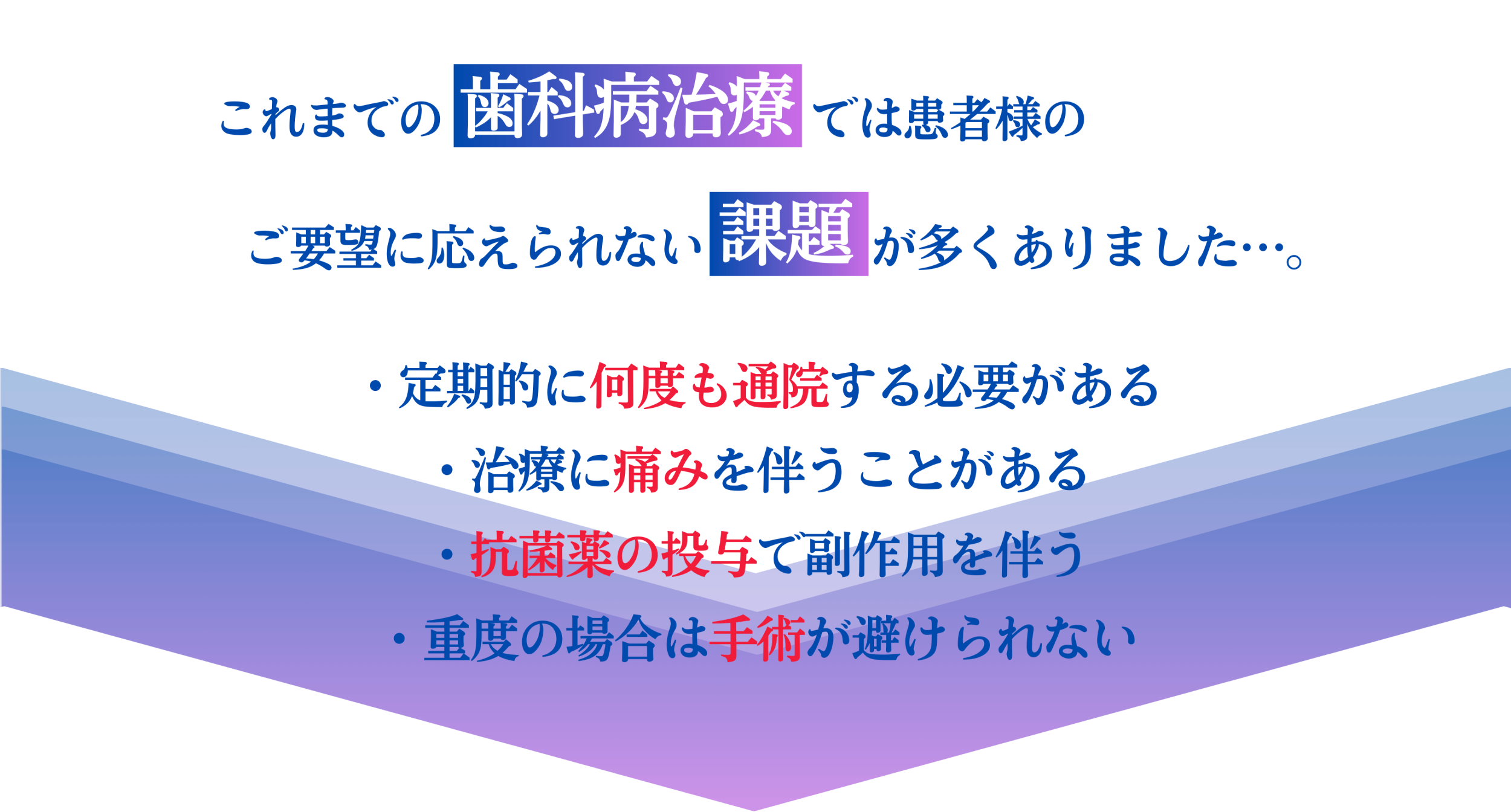 ・ブルーラジカル治療は失われた歯周組織を再生するものではなく、殺菌により歯周組織の破壊を防ぎ、歯周病の進行を抑えることを目的としています。